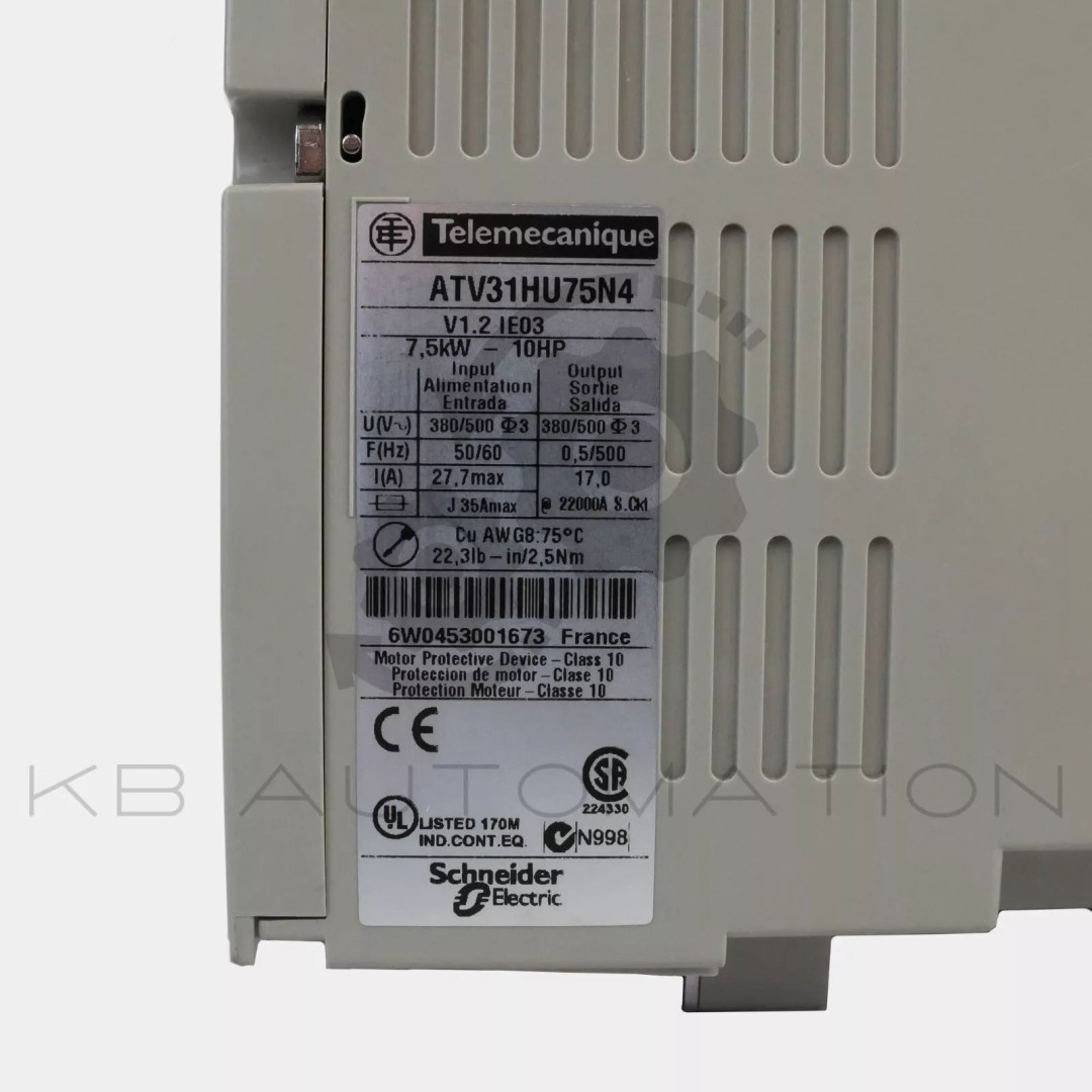 Altivar 31 Variable speed drive for asynchronous motors; Integrated EMC filter; [Us] rated supply voltage: 380-500VAC, 50/60Hz, 3-phase; Motor power: 7.5kW (10.0HP); Nominal output current: 17.0A at 4kHz; Switching frequency: 2...16kHz (adjustable)