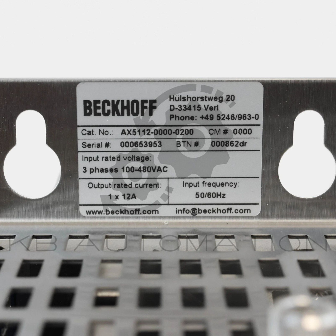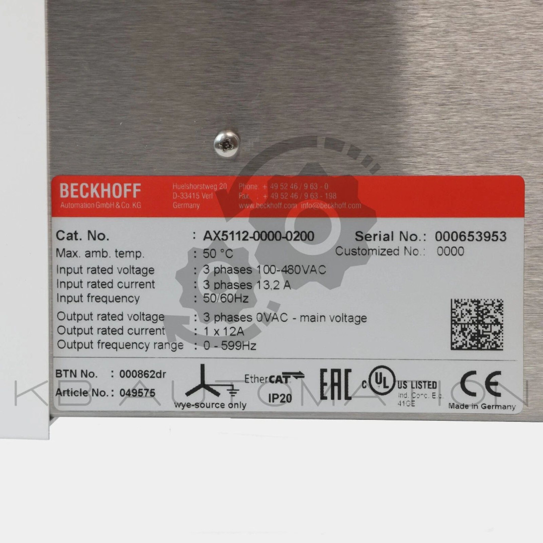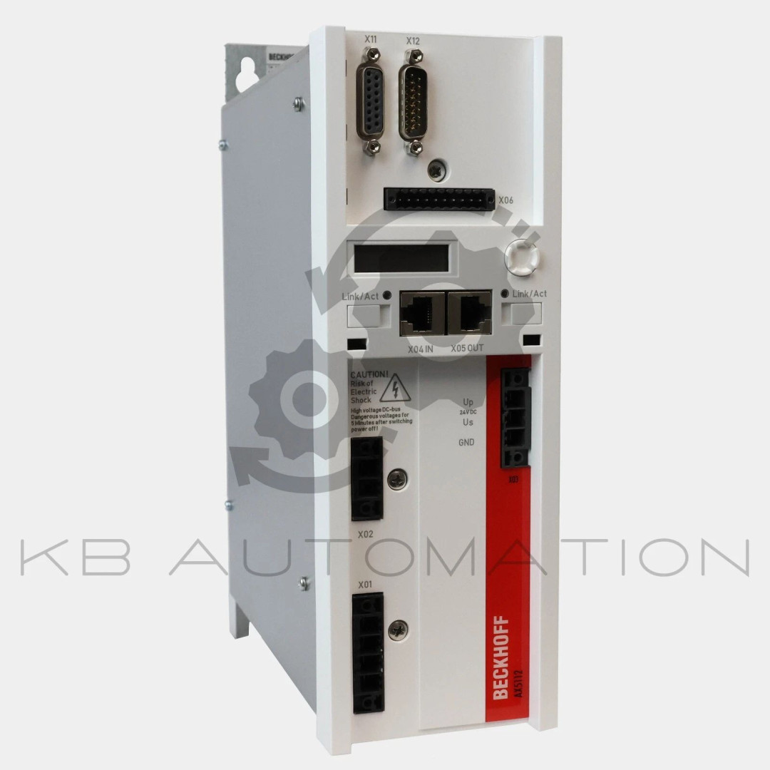 AX5000 Series Digital Compact Servo Drive; 1-axis module; Rated supply voltage: 3 x 100…480 V AC ±10%; DC link voltage: max. 875 V DC; Rated output current: 12.0 A; Peak output current: 26 A; EtherCAT interface; Feedback: SinCos 1 Vpp, resolver, EnDat 2.1, Hiperface, BiSS B, OCT