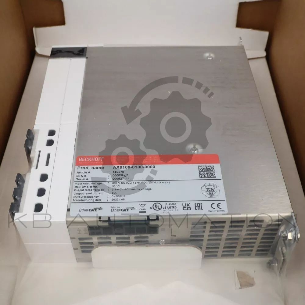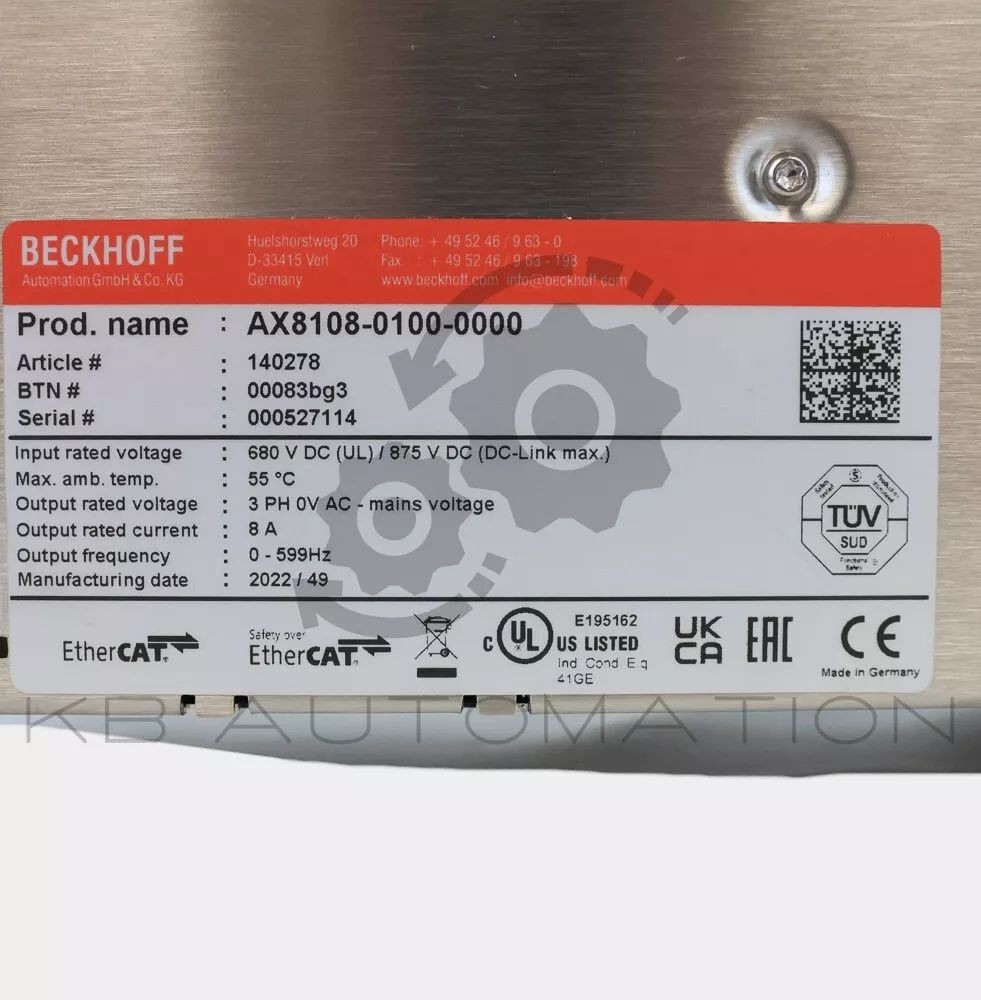 AX8000 Series Single-axis servo drive, axis module with TwinSAFE Logic; input rated voltage: 680 V DC (UL) 875 V DC (DC-Link max.); 8.0 A rated output current (channel); 20.0 A peak output current (channel); OCT, EnDat 3 feedback; Safe Torque Off (STO), Safe Stop 1 (SS1); EtherCAT