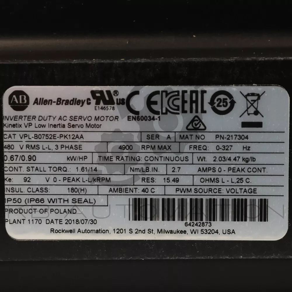 Kinetix VPL-Series Low-inertia AC servo motor, without holding brake, 480Vrms L-L, 3-phase; 75mm frame size, 2 magnet stacks, 3500 rpm rated speed; 18-bit absolute multi-turn digital encoder (Hiperface DSL protocol); Smooth shaft; Single SpeedTec Din connector