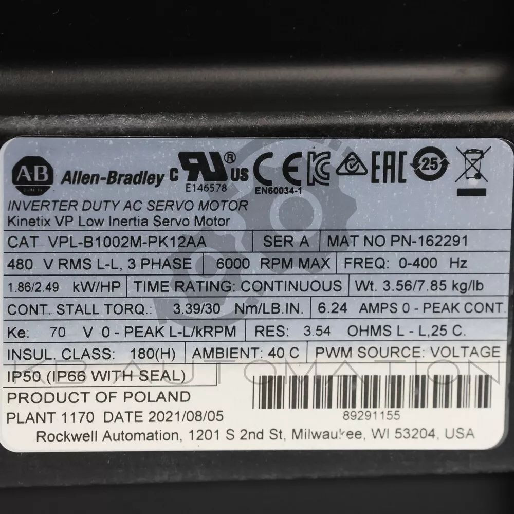 Kinetix VP low inertia servo motor, no holding brake, 400VAC, 100mm frame size, 2 magnet stacks, 6000 rpm rated speed, 18-bit absolute multi-turn digital encoder, smooth shaft, single SpeedTec Din connector